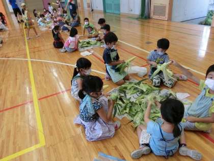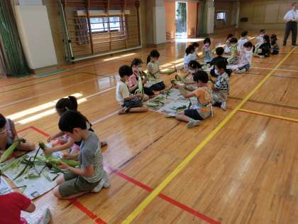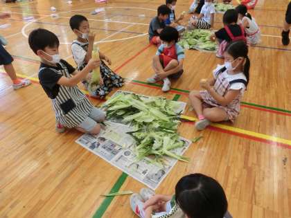2年生がとうもろこしの皮むきをしましました。栄養士がとうもろこしクイズと皮のむき方の説明をし、実物のとうもろこしの枝を見せると、子どもたちは興味深そうに観察していました。体育館で1人1本、丁寧にとうもろこしの皮をむきました。とても楽しそうに、上手に皮をむくことができました。最後は片付けまで協力して行い、給食室にむいたとうもろこしを届け、「よろしくお願いします。」と言って調理員さんに渡しました。