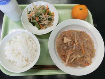 今週も毎日とても暑い日が続いていますが、みなさんは元気に登校できていますか?今日の麻婆春雨には、スタミナ食材として有名な豚肉、しょうが、にんにくが入っています。これらの食材には食べたものをエネルギーに変えたり、体をあたためて内臓のはたらきを活発にしたりするはたらきがあります。また、豆板醤の辛味は汗を出す作用があるので、体の中の熱を外に出してくれます。最後に冷たい冷凍みかんで体を冷やし、暑さに負けず頑張りましょう!