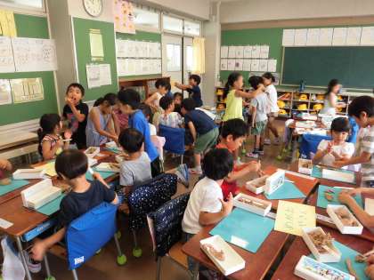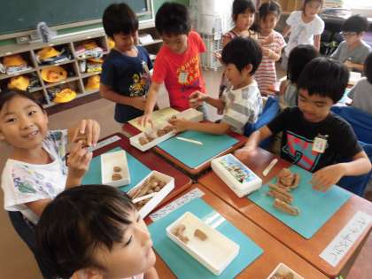 班で何屋さんにするか話し合い、品物をねん土で作ります。