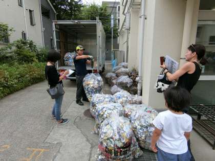 午前9時にアルミ缶回収業者の方に来ていただき、PTA担当の方々と計量し、トラックで引き取っていただきました。
