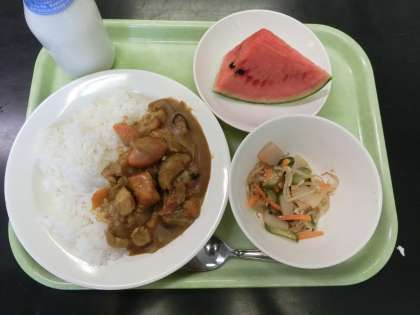 明後日からはいよいよ夏休みですね。1学期最後の給食は夏野菜のカレーライスにしました。夏野菜は以前お話した通り、暑い夏を乗り切るための力がたくさんつまっています。今日のカレーにはかぼちゃ、トマト、なす、ズッキーニなどの夏野菜が入っています。カレーだと苦手な野菜も食べやすくなりますね。野菜もお肉もごはんももりもり食べて、明後日からの夏休みを元気に迎えましょう!