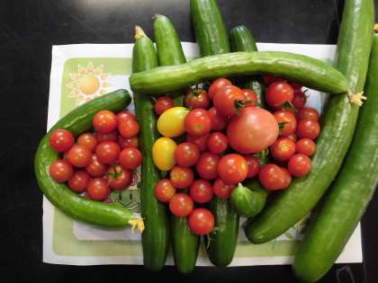 ミニトマト、きゅうり(グリーンカーテンより)がこんなにたくさん採れたので、本日開催される『さくみん食堂』に持っていきます。