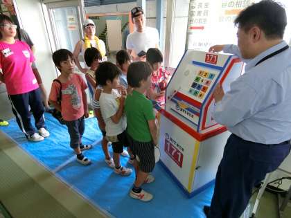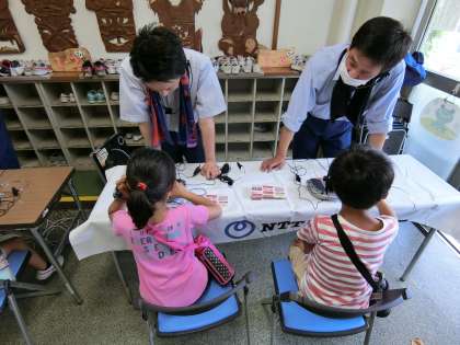 ダイヤル「171」を使った災害用伝言ダイヤルでは、実際に録音入力をし、自分の伝言を再生し聴きました。NTTスタッフのみなさんの丁寧なアドバイスを受けながら貴重な体験ができました。「家族で、どの電話番号にお互いの伝言を入れるのか、話し合って決めておくことが大切です。」とのアドバイスを受け、うなずきながら真剣な表情で聞き入る子どもたちでした。
