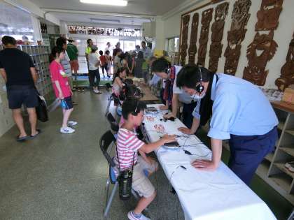 北校舎西昇降口では、「防災電話・災害用伝言ダイヤル」体験コーナーが設けられ、子どもたち一人ひとりが、防災電話の扱い方や災害用伝言ダイヤルを使った伝言の録音と再生の体験を行いました。