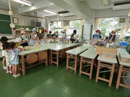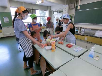 お手伝いの子どもたちも加わって、お母様方が手際よく、参加者分のカレーライスを賄うことができるように調理をしてくださっています。