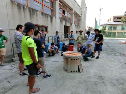 また、体育館脇では、区から委託を受けている防災担当者から、バーナーの使い方の講習会が開かれ、下準備を終えたカレーを作り上げるための大鍋の準備が進められています。