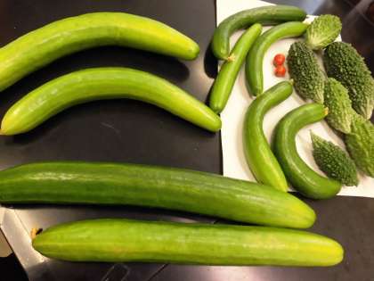 今日は、グリンカーテンからきゅうりとゴーヤを収獲しました。
