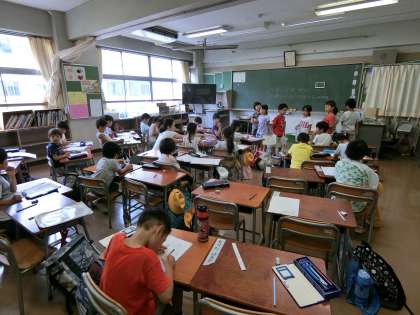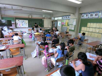 水泳教室の前後の時間を使って、希望参加の子どもたちが、自分のめあてで学習を進めたり、プリントの問題を解いて先生に見てもらったりしながら、一生懸命取り組んでいました。