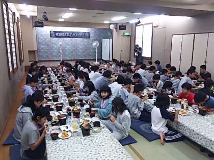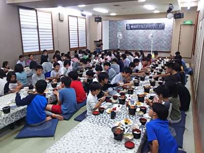 宿舎の大広間で、楽しく会話を弾ませながら、食事が進んでいます。お風呂に入って疲れもとれ、食欲旺盛な子どもたちです。