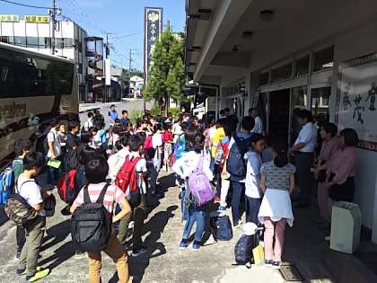 部屋の片付けをし、荷物をバスに積み込み、宿舎玄関前で閉園式を行いました。