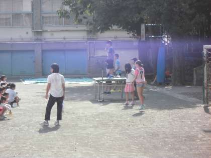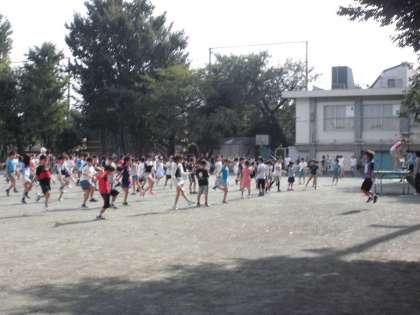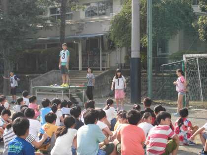 こちらは、校庭で行われた3〜6年生の様子です。同じように運動委員会の子どもたちの見本を見た後、様々な技に挑戦していました。