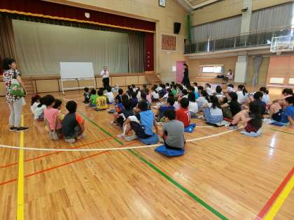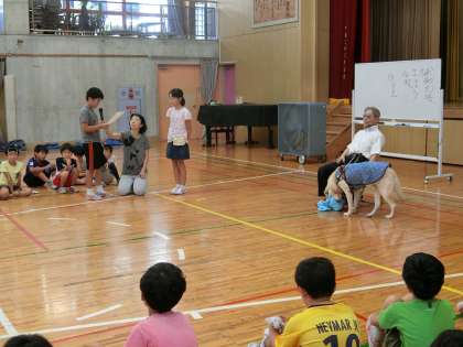 今日は目に障害のあるつばき教育研究所理事長の宮城武久先生と盲導犬ニースを講師としてお招きし、補助犬法に基づく盲導犬についての理解や活躍について学ぶとともに、目の見えない方のもつ白杖の意味や支援・声かけの仕方などについても学ぶ機会となりました。