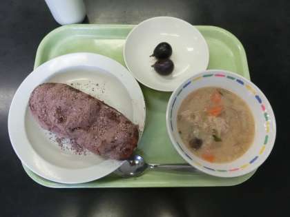 今日はみなさんの大好きな揚げパンです。いつものきな粉とは違い、ココアをまぶしました。きな粉は香ばしくておいしいですが、ココアもほろ苦くておいしいですよね。巨峰は秋の果物です。他の種類のブドウと比べて実が大きいことから、「ブドウの王様」とも言われるそうです。一粒にぎゅっと詰まったおいしさを、味わってください。