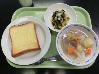 2学期が始まって1週間が経ちました。長い休み明けで、今週は5日間学校があります。週の後半でみなさんも疲れが出ているかもしれません。疲れたときには睡眠・食事・休養をとることがとても大切です。今日のポトフにはたっぷりの野菜が入っており、チーズや牛乳にはカルシウムがたくさん含まれています。コーンには、疲れをとるビタミンB1も豊富です。まずは給食をしっかりと食べて今週も元気に乗り切りましょう。