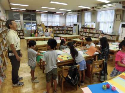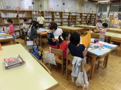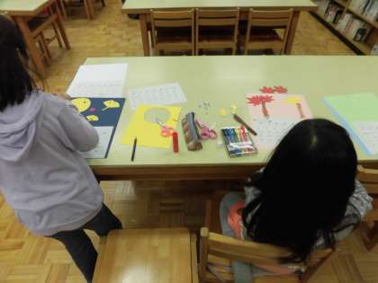 今日は9月24日の十五夜にちなんで「たぬきのおつきみ」と「14ひきのあきまつり」の読み聞かせをしました。楽しく聞いた後の秋のカレンダー作りでは、お月見の様子を作っている子が多かったです。時間をかけて作っている子もいて、すてきな作品ができあがりました。