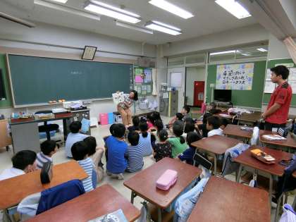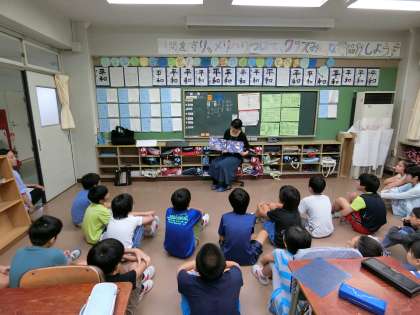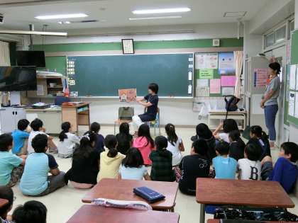 また、朝の時間は「朝読書」の時間でした。今日は5年1組・2組・3組の3学級で、お話しポケットの方々による読み聞かせがありました。教室の前後のスペースで、子どもたちは、楽しいお話を静かに聴き入っていました。