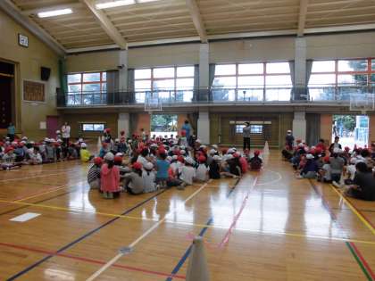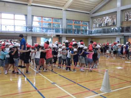 今日の児童集会は、「じゃんけん列車で勝ち残れ集会」でした。笹の子班で集まり、赤班は青班と、青班は赤班と、それぞれじゃんけんをします。負けた方は勝った方の後ろにつきます。最後に列車の先頭が赤か青かでそれぞれの班にポイントが入ります。赤同士、青同士でじゃんけんをしてしまうと自分の班が不利になってしまうので相手を探さなくてはいけません。