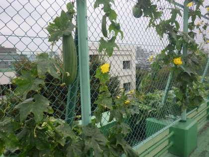 3階建ての校舎よりもさらにのび続けて、屋上にまでヘチマが実っていました。