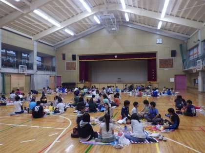 遠足用にお弁当を持ってきている4年生と5年生は、体育館で仲良く昼食を食べました!