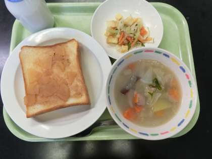 今日から10月の給食が始まりました。昨日はとても暑かったですが、朝夕は肌寒く徐々に秋らしくなってきましたね。今日はそんな秋らしさを感じられる献立にしました。秋色ポトフはいつものポトフと違って、さつまいもやきのこが入っています。肌寒いときに具だくさんのスープを飲むと、体の中からほっとあたたかくなりますね。アップルシナモントーストは、秋から冬にかけてが旬のりんごを甘く煮てトーストにしました。シナモンも体を温めてくれる食材です。しっかり食べて10月も元気に学校へ通いましょう。