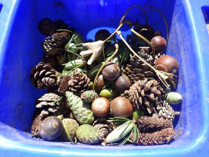 いろいろな種類のドングリや、緑や茶色の松ぼっくりを見つけることができました!