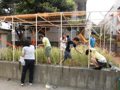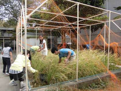 今日は、5年生が田んぼの泥の中まで入り込んで、草むしりをしていました。
