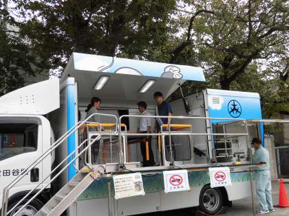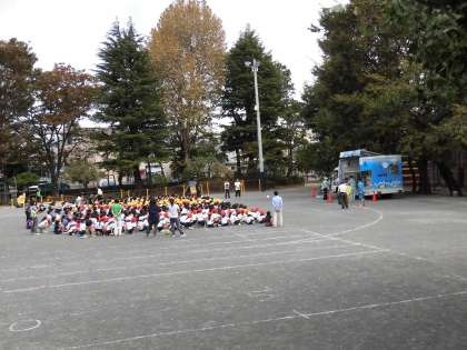 訓練終了後、起震車体験を行いました。まず教員が体験をし、感想を述べた後、6年生が体験しました。今回の起震車は震度7まで出せる車両で、かなりの揺れを体験したので、この後の生活に役立ててほしいと思います。