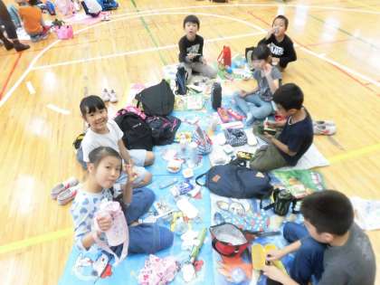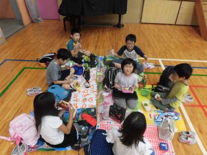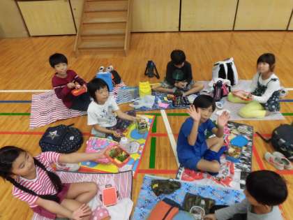少しでも遠足の気分を感じようと、2,3年生のみんなは体育館でお弁当をいただきました。
