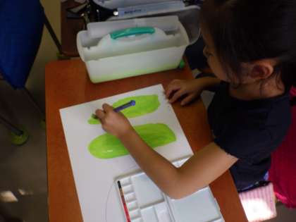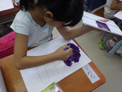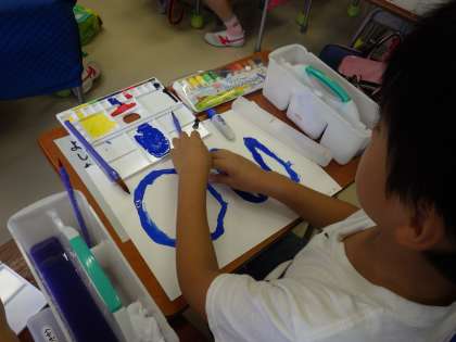 展覧会に向けて、1年生はもう何回も絵の具を使って画用紙に色をぬっています。