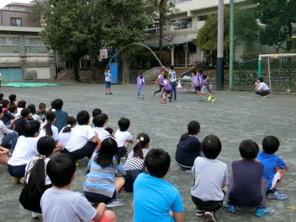 最初に運動委員会のみなさんが8の字連続跳びを紹介し、見事な演技に大きな拍手が送られました。そのあと、学級ごとに分かれて、低学年の学級には運動委員会のみなさんが回し手として入り、担任の先生も加わってみんなで楽しい時間を過ごしました。