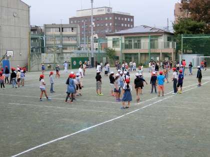 校庭・体育館・屋上の割り当てに基づいて、学年や学級での遊びを行い、後半は全校一斉に長縄跳びを楽しみました。