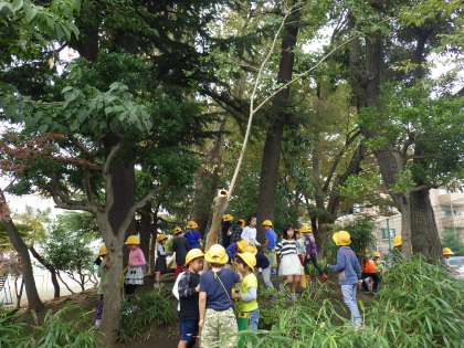本校は校庭の一角が林になっていて、多くの種類の木が植えられています。今日はその林の中でドングリを拾ったり、木の葉を集めたりしました。