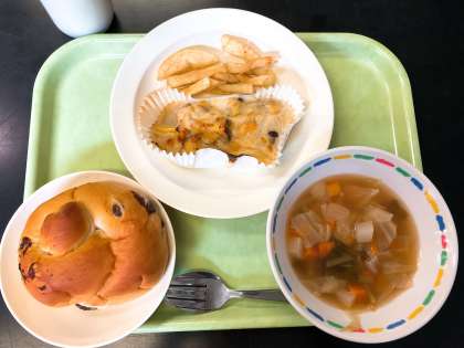 ぶどうパンには、レーズンが混ぜ込まれています。レーズンはぶどうを干したもので、栄養と甘みがぎゅっと詰まっています。秋野菜のグラタンは、さつまいも、しめじ、れんこんなど、秋においしい食材がたくさん入っています。食感もホクホク、コリコリ、サクサクと楽しいですよね。