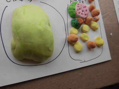 今日は、パフェにのせるものを考えて紙ねん土で作りました。