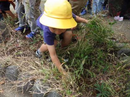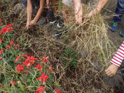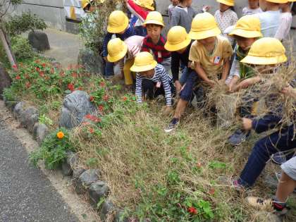 1年生は昨日のゴミ拾いに続き、今日は花壇の雑草を取り除く活動をしました。