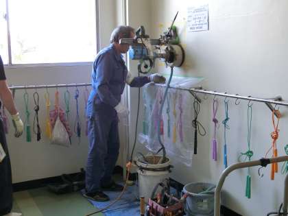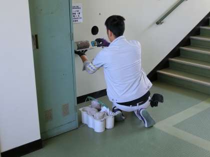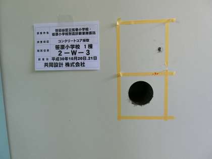 今回の耐震診断は、校舎等の安全確認のために行うもので、今日はそのための資料採取(コア抜き)作業を行うものです。校舎棟(図書館を含む)の20数か所で採取し、今後の診断につなげていきます。