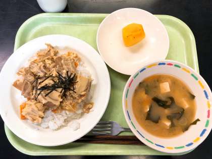 「麩」とは、小麦粉の中のタンパク質で作った食品です。小麦粉に水を加えてこね、にごった汁をすてる作業をくりかえすと、「生麩」というものができます。この生麩を焼いたものが「焼き麩」と言われ、よくみそ汁やお吸い物に使われます。生麩はもちもちとした食感で、焼き麩はふわふわとした食感を楽しめます。また、麩は水分をよくすうので、今日のどんぶりのようにおいしい煮汁をたっぷり吸ってくれます。