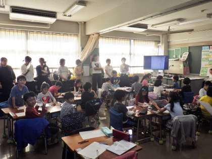 区内の小学校から30数名の先生方が訪れ、5時間目に1年3組で日本語の授業を参観しました。