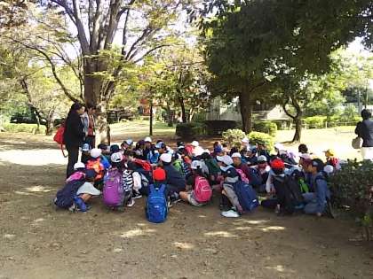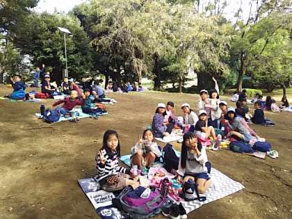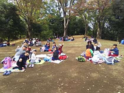 公園の一角の小高い丘で、お弁当の時間を過ごしています。おいしいお弁当に、笑顔いっぱいの子どもたちです。