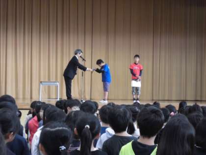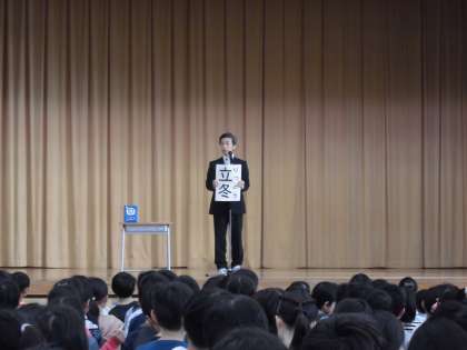 今日の校長先生のお話のキーワードは「立冬」でした。同じ時期でも地域によってずいぶん違いがあるというお話がありました。続いて、11月8日の「いいはの日」についてのお話がありました。保健室前の掲示板に関連する掲示物が貼ってあります。ぜひ見てください。続いて、少年野球夏季大会の準優勝チームの表彰がありました。台風の影響で夏の大会が延び延びになり、ようやく決勝戦が行われたそうです。既に秋季大会も始まっているとのこと。そちらも頑張ってほしいです。