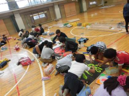 3・4校時に、5年生は展覧会に向けて共同作品を作成しました。蛍光色の絵の具を使って、黒い画用紙に海の生き物を描きました。一人ひとりのイメージを共有して、グループで話合いながら一つの作品を作り上げました。できあがった時のほっとした顔は、友達と1つの作品を作り上げた達成感に満ちあふれていました。一人ひとりの思いが詰まった作品を、当日ぜひご覧ください。