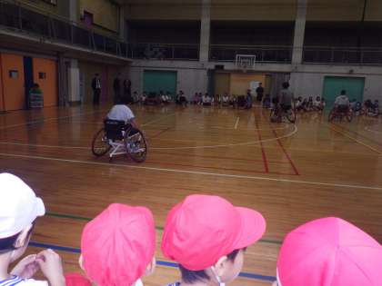 車いすを上手に操作する選手を見たり、車いすバスケットボールに挑戦する6年生の姿を見たりしました。