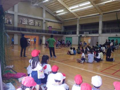 本日体育館で行われたオリンピック・パラリンピック教室(車いすバスケットボール)は6年生が対象でしたが、校庭で体育をしていた1年生も少しだけ体育館の様子を見学しました。