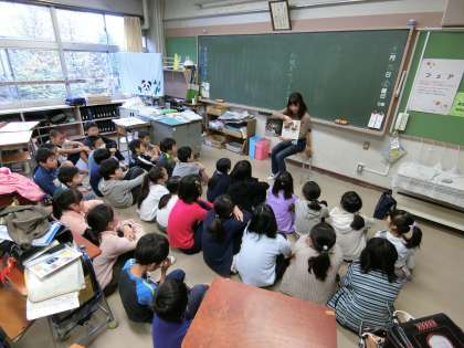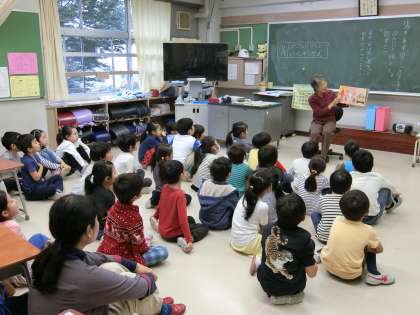 今日の朝読書の時間には、1年1組と4年2組の2学級で、お話しポケットの方々によるお話(読み聞かせ)が行われました。