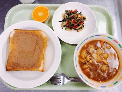 今日は展覧会ですね。みなさんが一生懸命作った作品が展示されます。ちょうど今日は11月16日で「いい色の日」ですね!給食も、いつもみなさんにおいしそう!と思ってもらえるように工夫しています。今日のサラダは、緑色のきゅうり、黄色のコーン、赤色のピーマン、黒いひじきに白い大根と様々な色が入っています。野菜をながくゆでていると、鮮やかな色ではなくなってしまうので、ゆで方も気をつけています。見た目からもおいしさを感じてみてください。