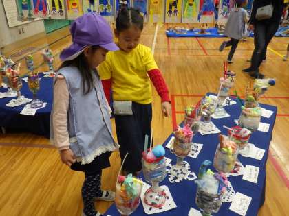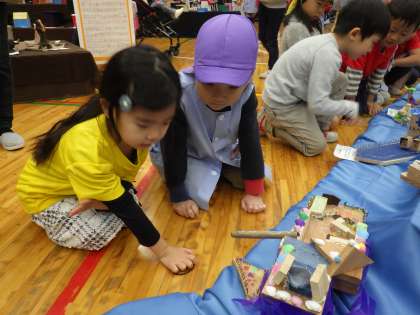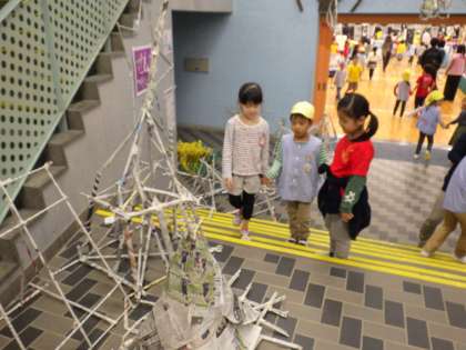 1年生と幼稚園児がいっしょに展覧会の会場を見て回っている様子です。