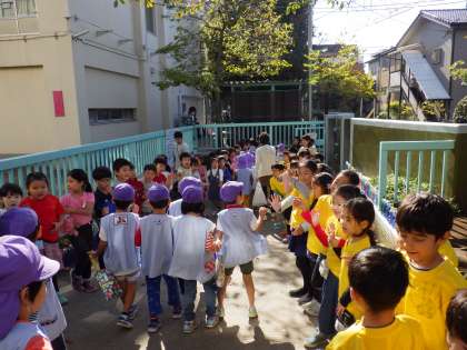 展覧会を見に来てくれた幼稚園の年長さんを、1年生は正門前でお見送りしました。