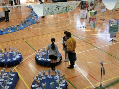 最初は緊張気味で、声をかけていただいた方への説明をする場面が多くありましたが、徐々に自信が付き、自分たちから声をかけて説明を聞いていただく場面が多くなりました。45分間の担当時間を終えた子どもたちからは、「頑張れた!」「楽しかった!」「○○人の人に説明できた!」「もっとやりたかった!」など、達成感と充実感で笑顔がいっぱいでした。