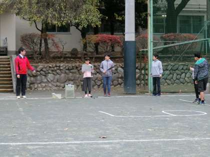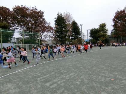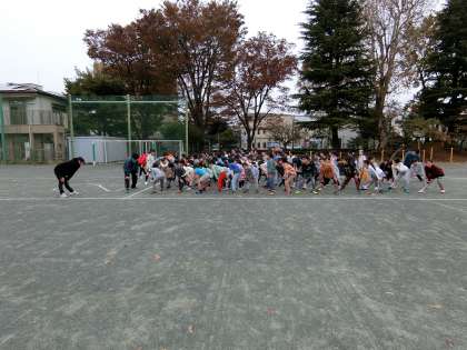 そして、準備運動をしたあと、校庭のトラックを3つのコースに分け、低学年コース・中学年コース・高学年コースを使って、みんなで元気よく走りました。各コースの先頭には運動委員会のみなさんが分担して先導役を務め、2周目からは一人ひとりが自分のペースで走りました。
