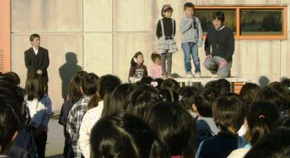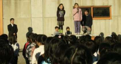 今学期は、1・4年生のあいさつ標語を壁面に掲示しています。本日は1・4年生の代表が、全校の子供たちにあいさつ標語を発表しました。